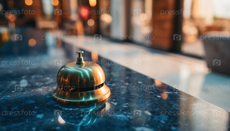Золотой бронзовый служебный колокол сидит на полированном мраморном столе в элегантном лобби отеля с теплым солнечным светом и расплывчатым фоновым архитектурой