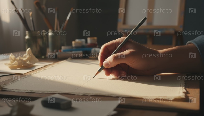 Рука художника рисует первую строку на пустой бумаге в мягком студийном свете концепция нового начала внимательности журналистики и творческого процесса во время тихого вечера