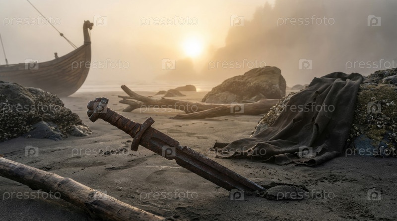 Древний викингский меч застрял в темном вулканическом песке на туманном пляже при закате солнца возле деревянного длиннокорабля и таинственный темный плащ, опирающийся на береговые скалы