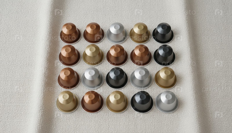 Минимальное бледное нейтральное расположение различных металлических капсул кофе в мягком теплом белом свете, образуя упорядоченную композицию с тонким отражающим тоном