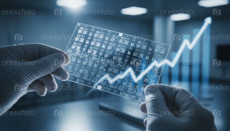 Инженер-электронщик, держащий прозрачную микрочиповую подложку со схемами интегральных схем, перекрывающими синий фон