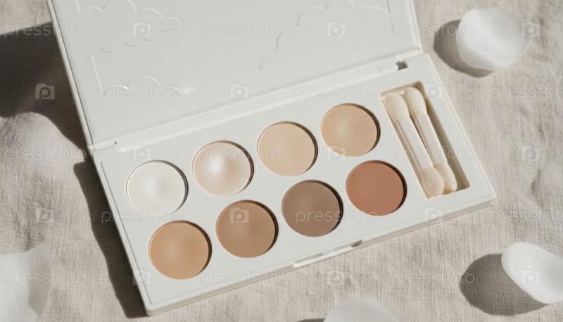 Минимальная прозрачная палитра макияжа в мягком теплом белом тоне, расположенная в бледном нейтральном свете, где нежная диффузная яркость подчеркивает гладкие изысканные поверхности. Cloud Dancer 2026 Color of the Year