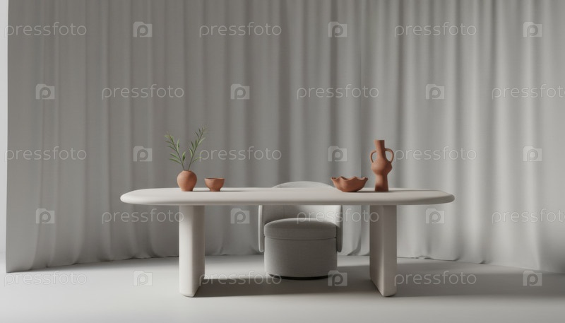 Современный минималистический интерьер столовой с тонами Cloud Dancer, включая скульптурный стол и теракотовые вазы в рамках декоративных тенденций 2026 года