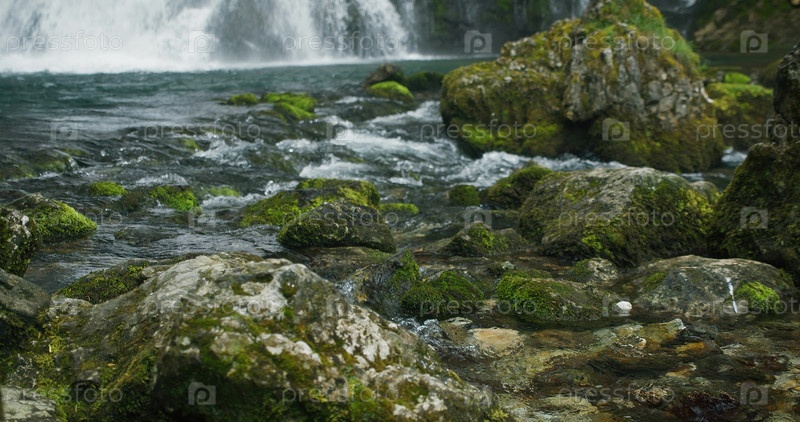 Горная река течет вниз по склону. Чистая вода пенообразна и брызги на валуны, заросшие зеленым мхом. Водопад Голлинджер в Зальцбурге Австрия
