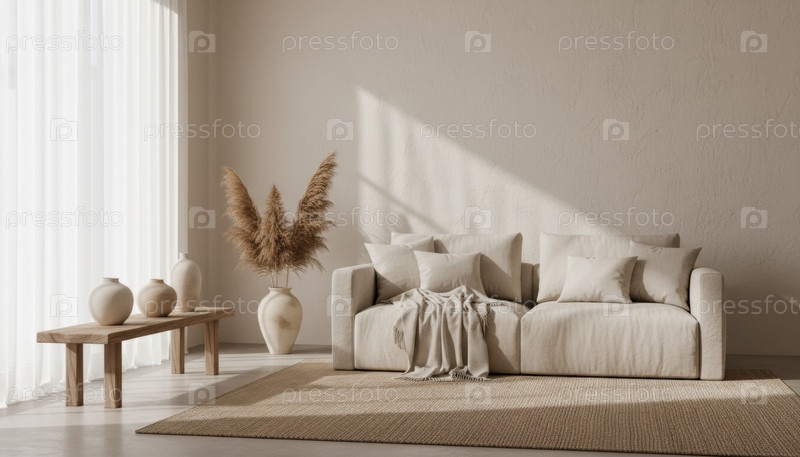 Внутренний снимок имеет мягкий белый облачный модульный диван с одеялом и подушками, травой панпаса в вазе и деревянной скамейкой с керамикой рядом со солнечным окном