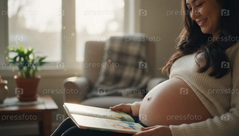Улыбающаяся беременная женщина сидит в солнечной гостиной, читая детскую книгу своему нерожденному ребенку во время спокойного дня дома