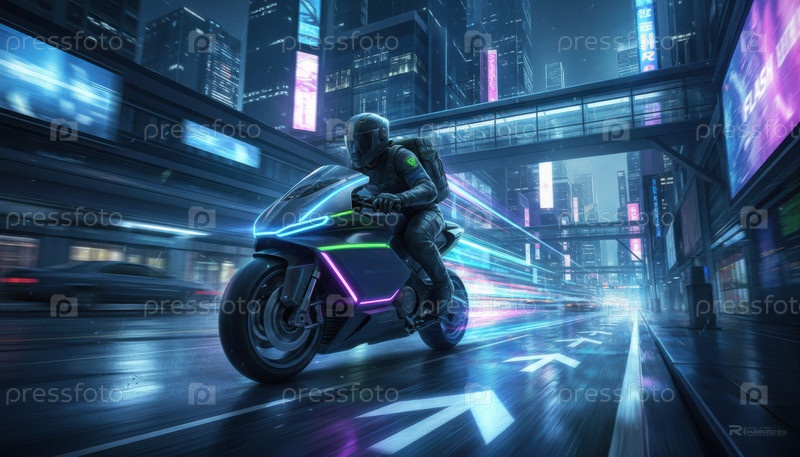 Футуристический мотоциклист, освещенный неоном и едущий с высокой скоростью по дождливому кибер-городу, изображает прогресс технологий, тенденции городской ночной жизни и концепцию мобильности следующего поколения