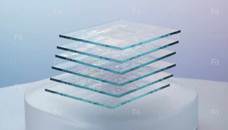 Абстрактная визуализация наложенных прозрачных стеклянных плит с светящимися электронными схемами, представляющими футуристическую архитектуру компьютерного процессора
