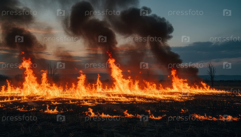 Лесной огонь сжигает сухое поле на закате, символизируя изменение климата экологический кризис и осознание стихийных бедствий