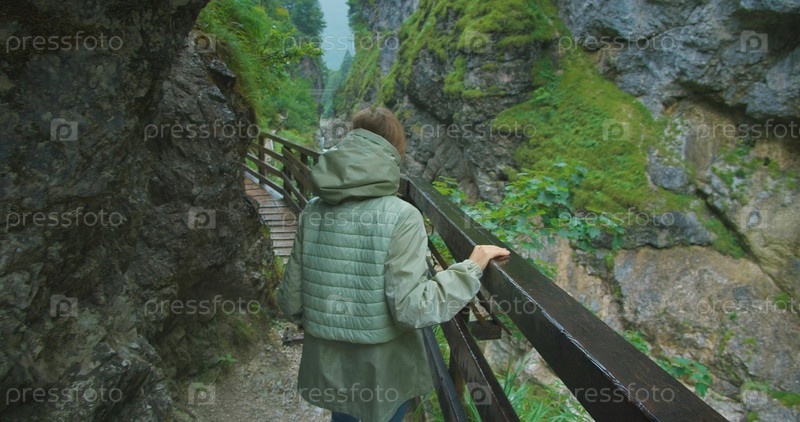 Женщина в зеленом плаще смотрит вверх и наслаждается спокойным дождливым днем на природе, дыша свежим воздухом