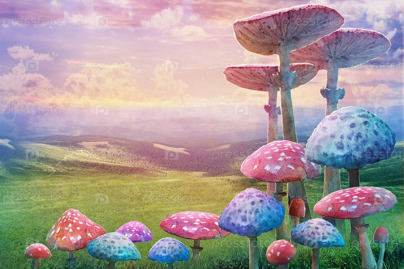 Фантастический пейзаж страны чудес с грибами, цветами лилий, морфо-бабочками и луной. иллюстрация к сказке "Алиса в стране чудес"