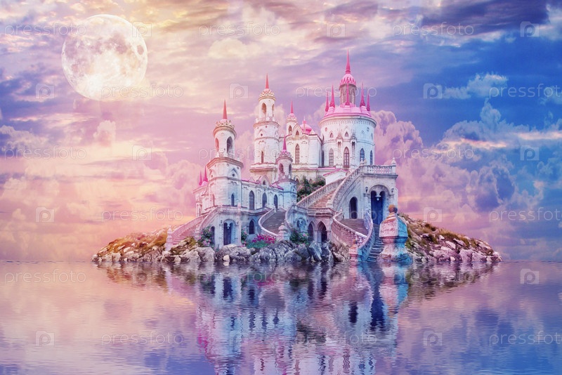 Фантастический пейзаж с луной. фоне страны чудес. красивый остров со старинным замком отражается в воде на закате