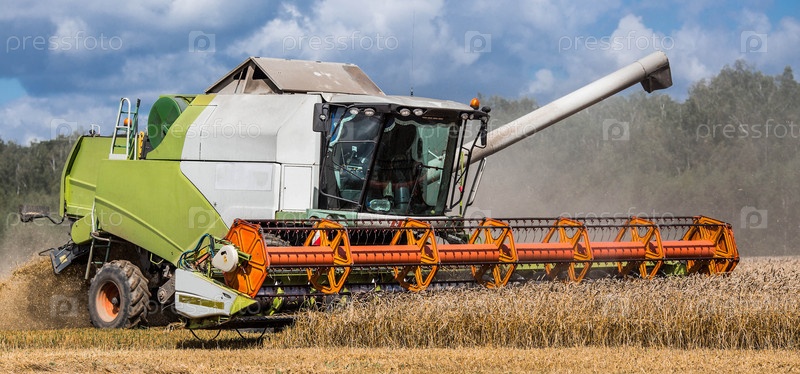 Сельскохозяйственная промышленность. комбайн подбирает золотые колоски спелой пшеницы. концепция посадки и сбора обильного урожая. сельскохозяйственные машины