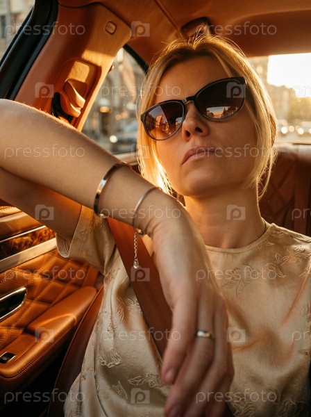 Стильная женщина в солнечных очках в автомобиле, летний лайфстайл портрет