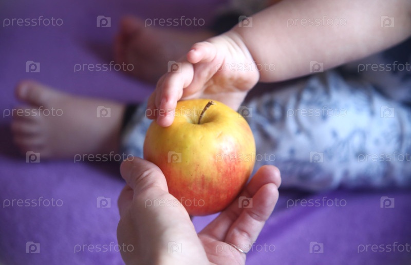 Руки женщины, протягивающая яблоко маленькому ребенку крупным планом