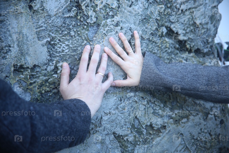 Руки мужчины и женщины, скрепленные вместе у каменной стены крупным планом