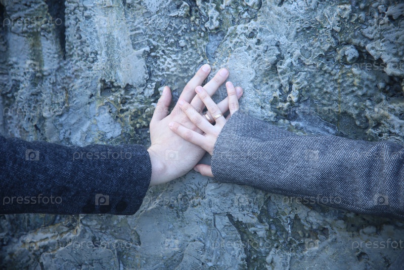 Руки влюбленных мужчины и женщины, скрепленные вместе у стены крупным планом