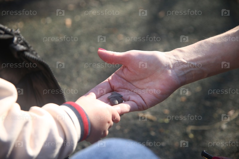 Руки женщины с камнями в руке и маленькая рука ребенка крупным планом