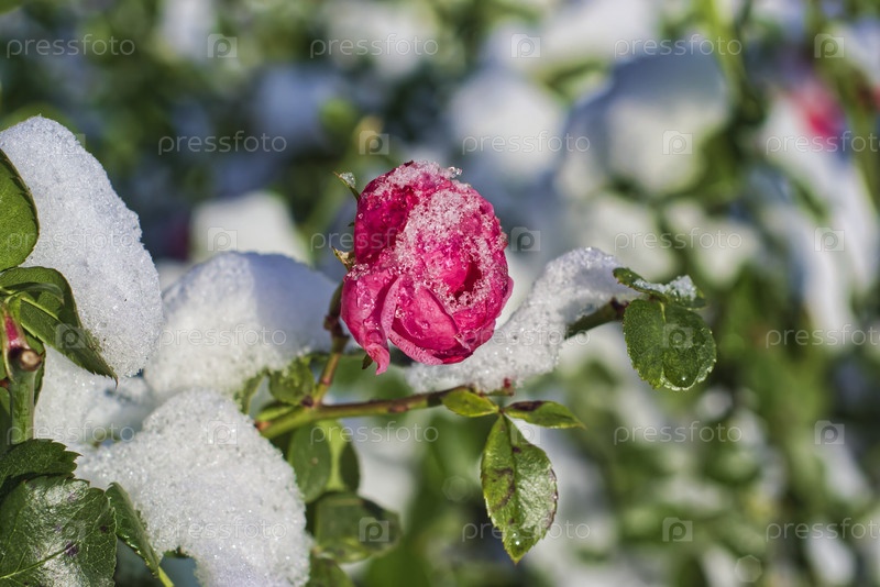 Роза, покрытая снегом на фоне зеленой травы в саду