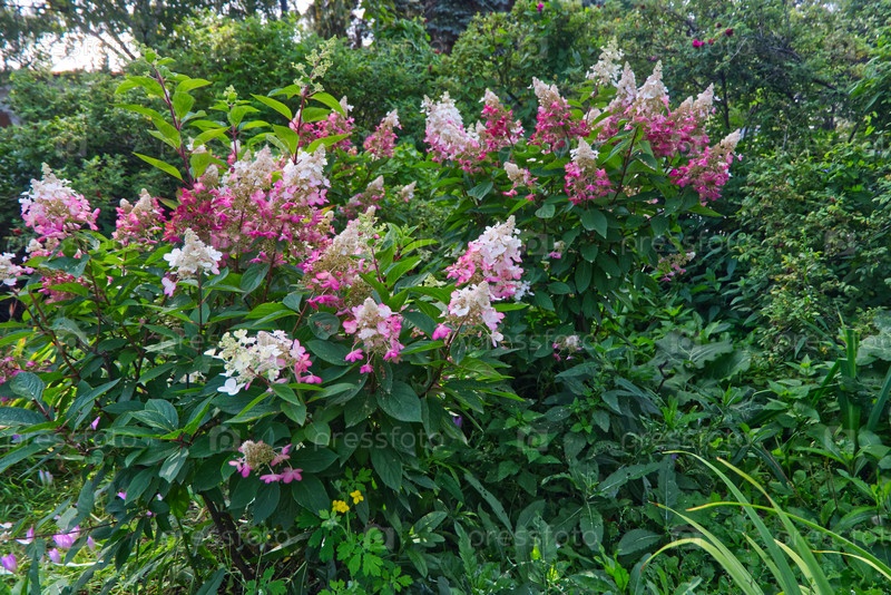 Розовые и белые цветы Hydrangea macrophylla в саду