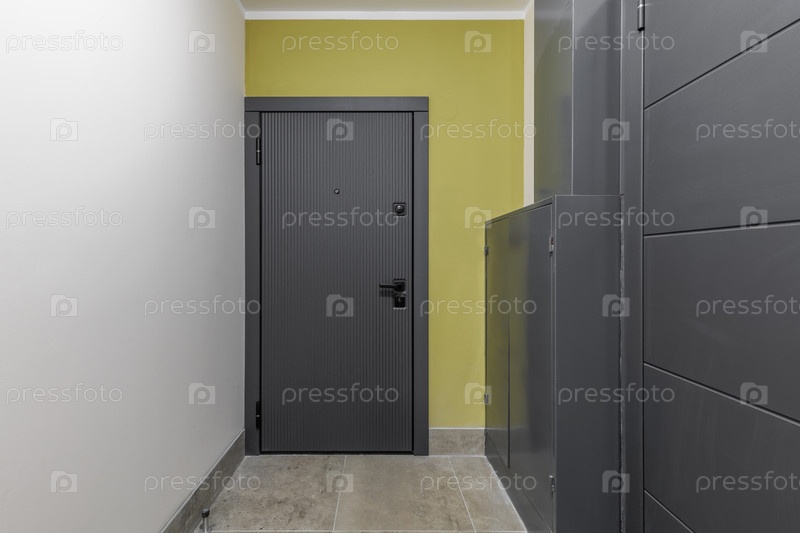 Вход в современную квартиру с темной текстурированной дверью безопасности