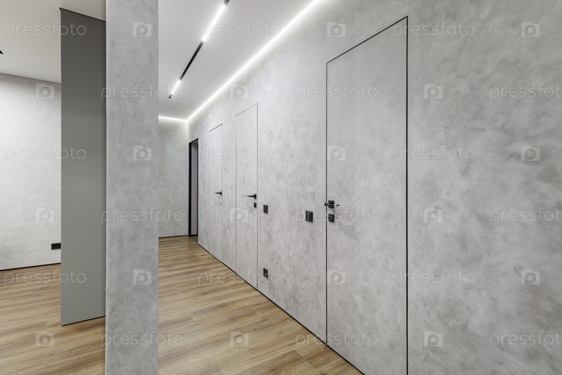 Широкоугольная перспектива современного коридора квартиры с невидимыми дверями, интегрированными в седые текстурированные стены.Дизайн подчеркивает черное оборудование, линейное светодиодное освещение потолка и теплые деревянные полы