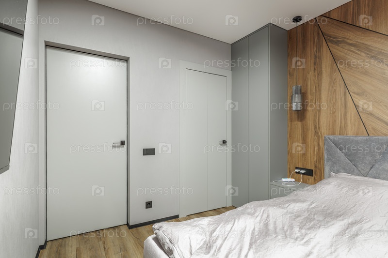 Минималистский дизайн с деревянной акцентной стеной, серыми гардеробами и дверью с подводным покрытием, создавая чистое и организованное жилое пространство