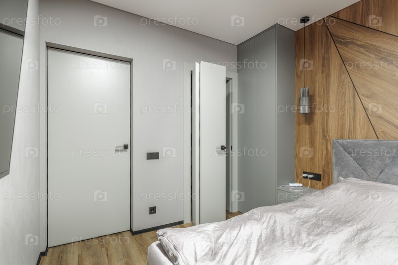 Подробный взгляд на белую двухслойную систему дверных книжек в современной спальне.Это пространствосберегающее решение обеспечивает доступ к шкафу, при этом плавно интегрируется с минималистическими серыми стенами и деревянным декором