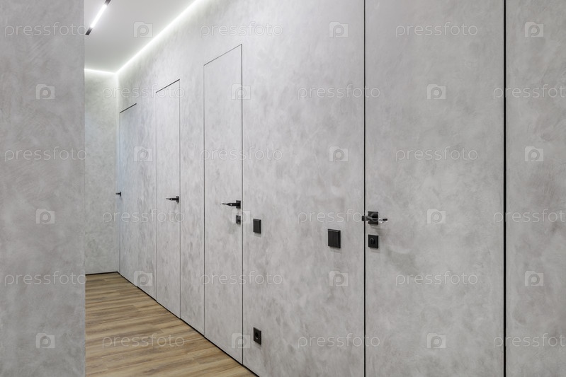 Перспективный вид современного коридора квартиры с несколькими невидимыми дверями, установленными вниз.Дизайн подчеркивает седые текстурированные стены, минималистические черные ручки и скрытое светодиодное освещение потолка над деревянным полом