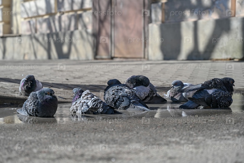 Весенние городские голуби купаются в луже на тротуаре