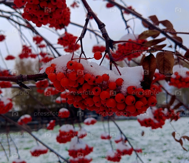 Гроздь красной рябины под первым снегом