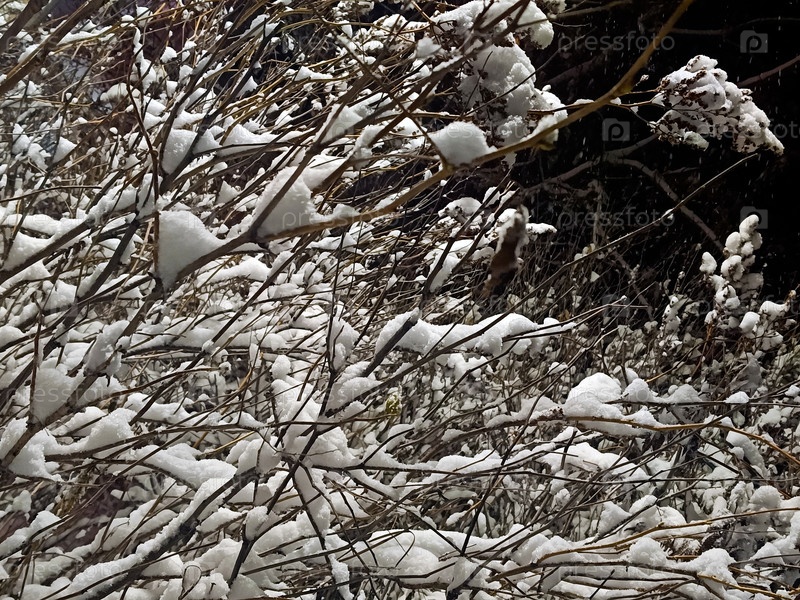 Заснеженные ветви кустарника в сумерках