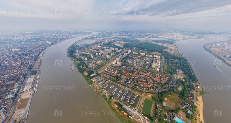 Антверпен, Бельгия. Панорама города. Река Шелда (Эскаут). Летнее утро. Вид с воздуха