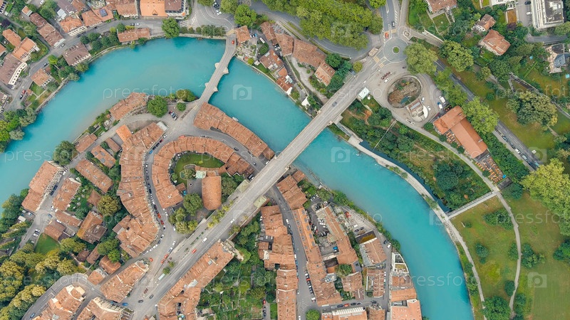 Берн, Швейцария. Историческая улица Крамгассе, Нейдегбрук. Панорама города с видом на исторический центр. Летнее утро, Aerial View