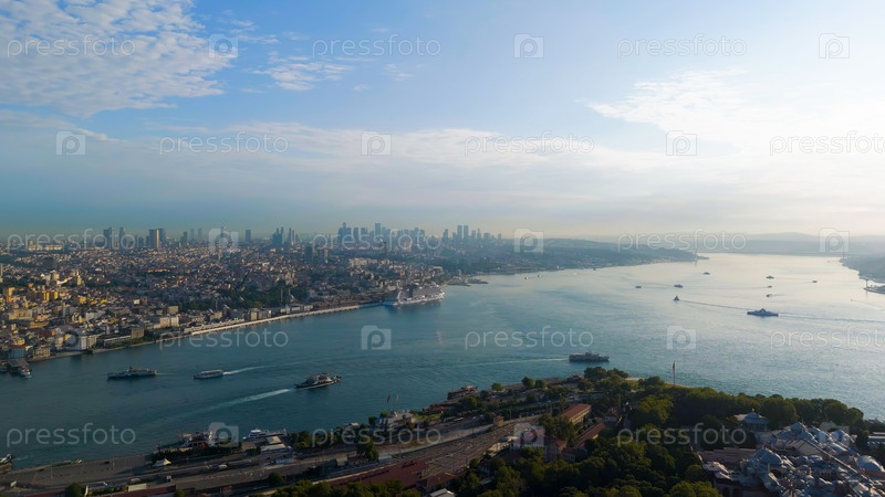 Панорамный вид Босфорского пролива и Золотого Рога с кораблями, мостами и горизонтом города под голубым утренним небом