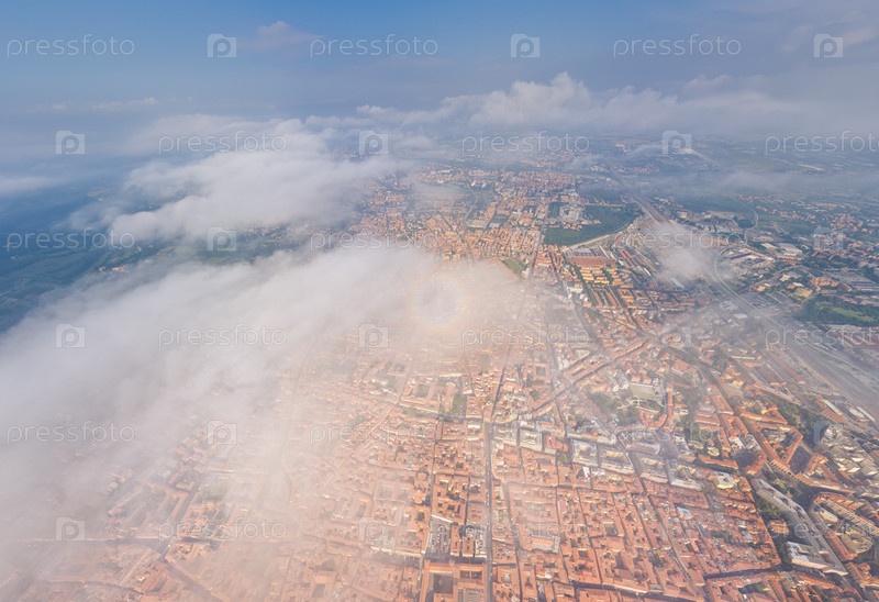 Болонья, Италия. Исторический центр. Панорама города в летний день. Летание по облакам. Вид с воздуха