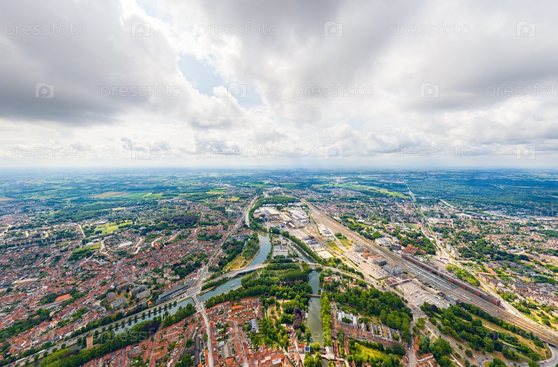 Брюгге, Бельгия. Центр города и его окрестности. Жилые и промышленные районы. Панорама на город. Летний день с облачной погодой. Вид с воздуха