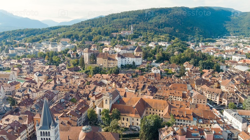 Аннеси, Франция. Замок Аннеси. Исторический центр города с рекой Тиу. Аннеси - город в Альпах на юго-востоке Франции, Aerial View