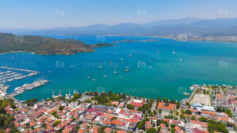 Панорама из воздуха современного городского ландшафта Фетхие с лесистыми горами, подробной береговой линией, многочисленными яхтами в заливе в ясный день
