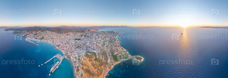 Кусадаси, Турция. Цилиндрическая воздушная панорама на закате. Круизный лайнер в солнечном сиянии на воде, Остров Голубей, гора Кесе, яхта-марина, пляжи. Панорама 360