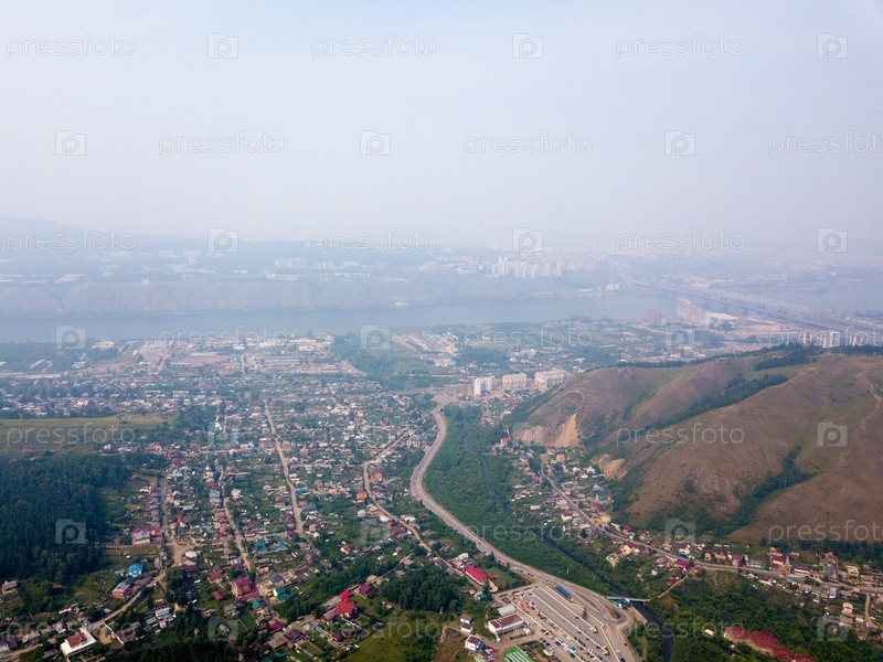 Вид на Красноярск.Река Базаиха впадает в Енисей.Из воздушной фотографии с дронов