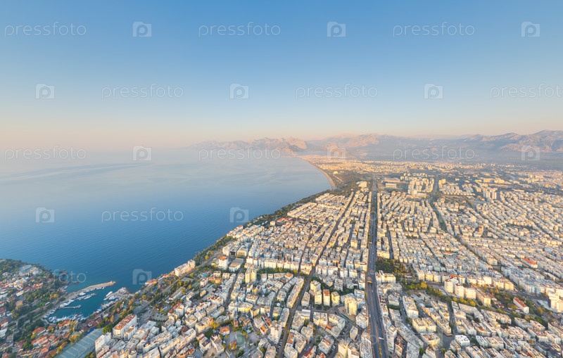 Панорама из воздуха современных жилых районов вдоль береговой линии, где Средиземное море встречается с городскими кварталами под летним утренним небом