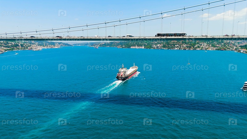 Грузоперевозчик проходит под мостом мучеников 15 июля на Босфорском проливе в яркий солнечный день с городским горизонтом