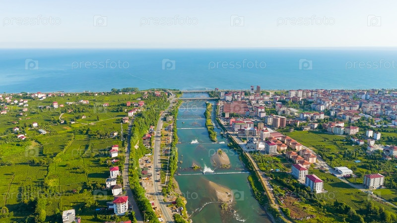 Ардешен, Турция. Место, где река впадает в Черное море. Долина реки Фиртина. Солнечное утро, взгляд с воздуха
