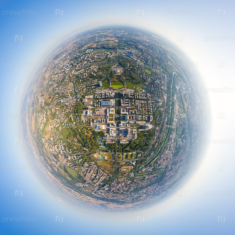 Рим, Италия. Всемирный выставочный квартал - EUR. Панорама города летом утром. Солнечная погода. 360-градусная панорамная аэрофотосъемка астероида