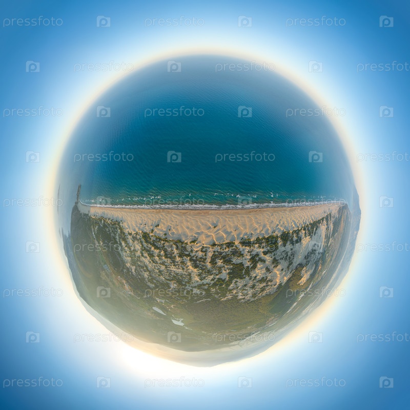 Вид на береговую линию пляжа Патара, Средиземное море, горы, древний город и теплицы утром. 360-градусный панорамный астероид