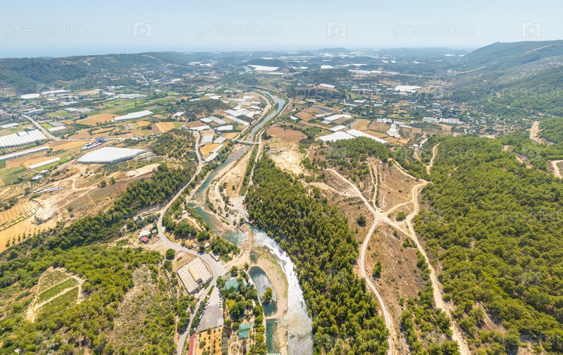 Какалар, Аланья, Турция. обширная воздушная панорама речной долины с сельскохозяйственными участками, парниковыми рядами, линией деревьев и лесистыми горными хребтами