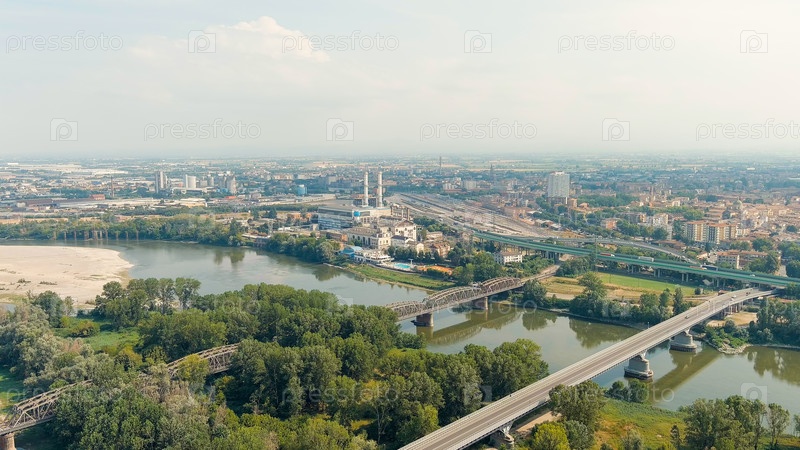 Пьяченца, Италия.Полет из города.Шоссе и промышленная зона.Река По.Летний день, Aerial View