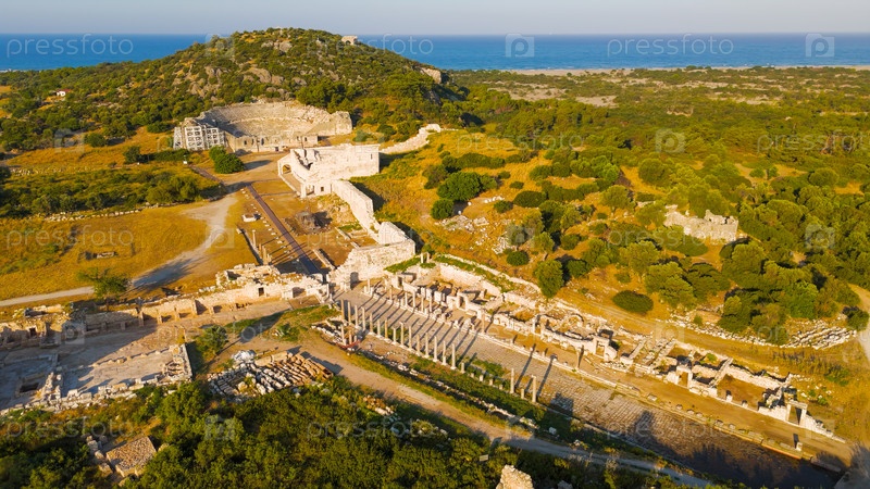 Гелемис, Турция.Колоннадная улица и Агора в древнем городе Патаре, главной магистрали и коммерческого центра столицы Ликии летом утром.Вид с воздуха