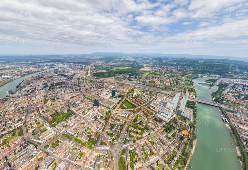 Базель, Швейцария Панорама города Река Рейн Летний день Вид с воздуха